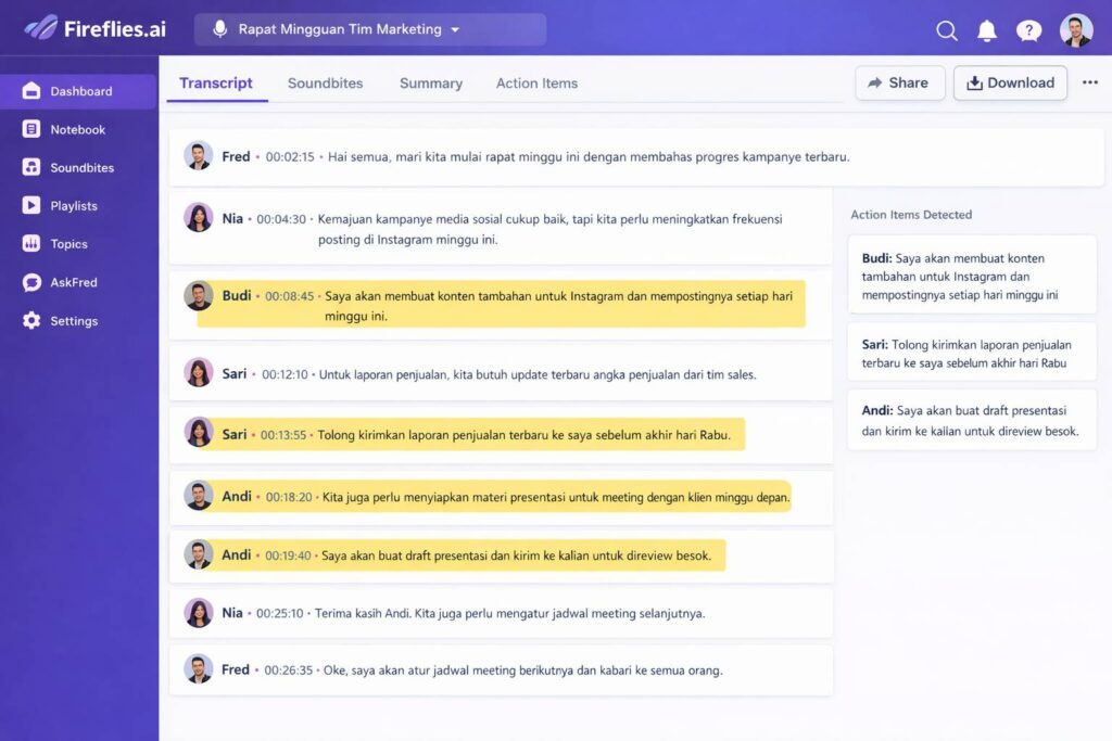 Selain transkrip, ada beberapa fitur yang bikin Fireflies.ai jadi andalan saya: