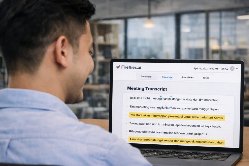 Fireflies.ai punya akurasi transkrip bahasa Indonesia sekitar 85-92% tergantung konteks. Cukup untuk internal use, tapi masih butuh editing untuk dokumen formal atau legal.